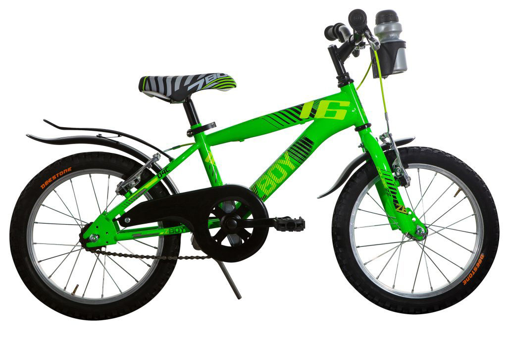 Bicicletta da bimbo, 16’’ completa di borraccia, carter copricatena, cerchi e freni v-brake in alluminio, telaio predisposto per stabilizzatori laterali e cavalletto laterale in alluminio