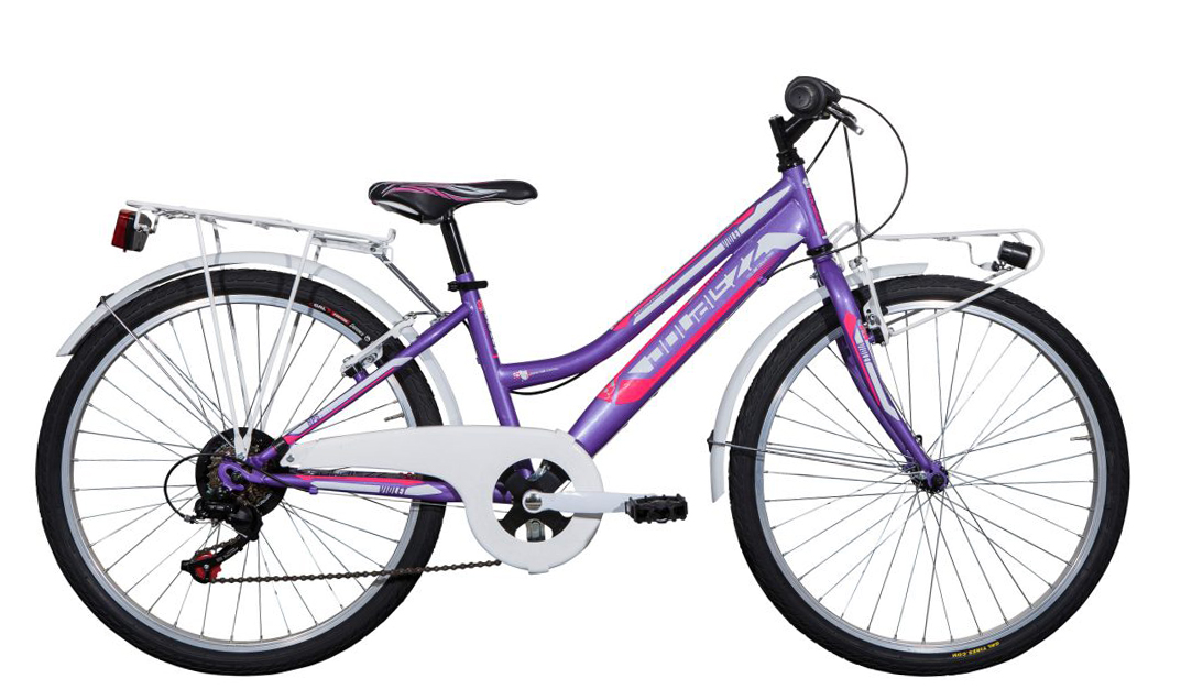 City bike ragazza, 24’’ completa di carter, parafanghi, portapacchi e portacesto, fanale anteriore e posteriore a led, cavalletto laterale, freni v-brake in alluminio, cambio Shimano a 6 velocità, ruote in alluminio con sgancio rapido anteriore