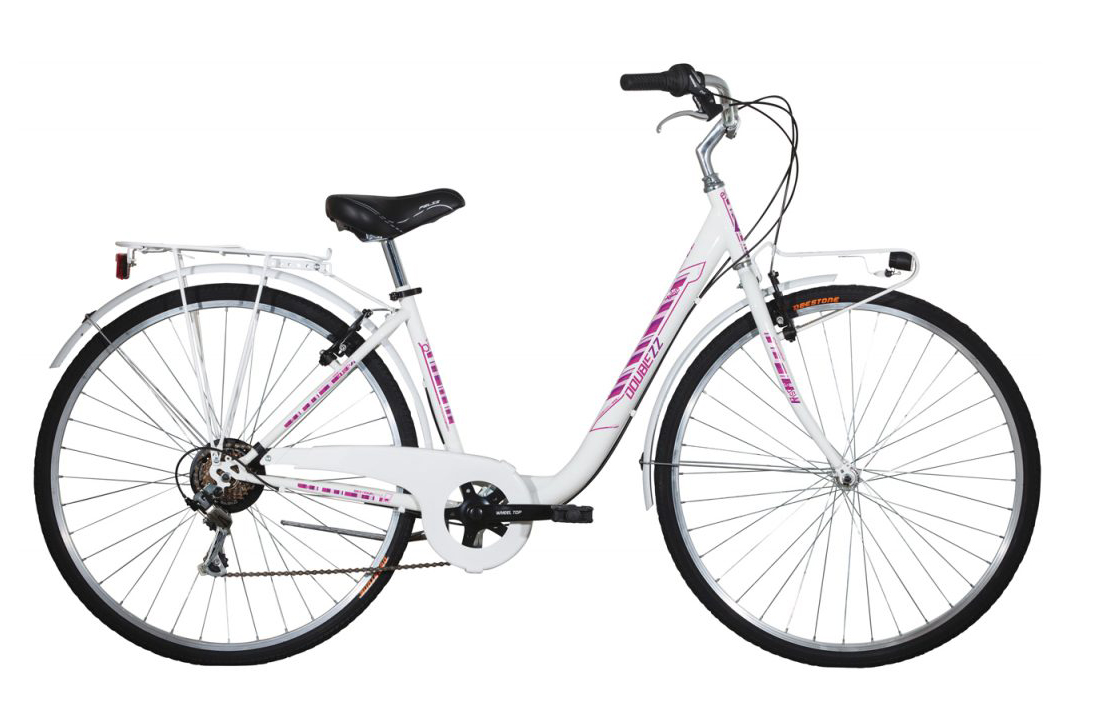 Cambio Shimano 6 rapporti, freni tradizionali, cavalletto, luci ant post, porta pacchi colore bianco satinato.